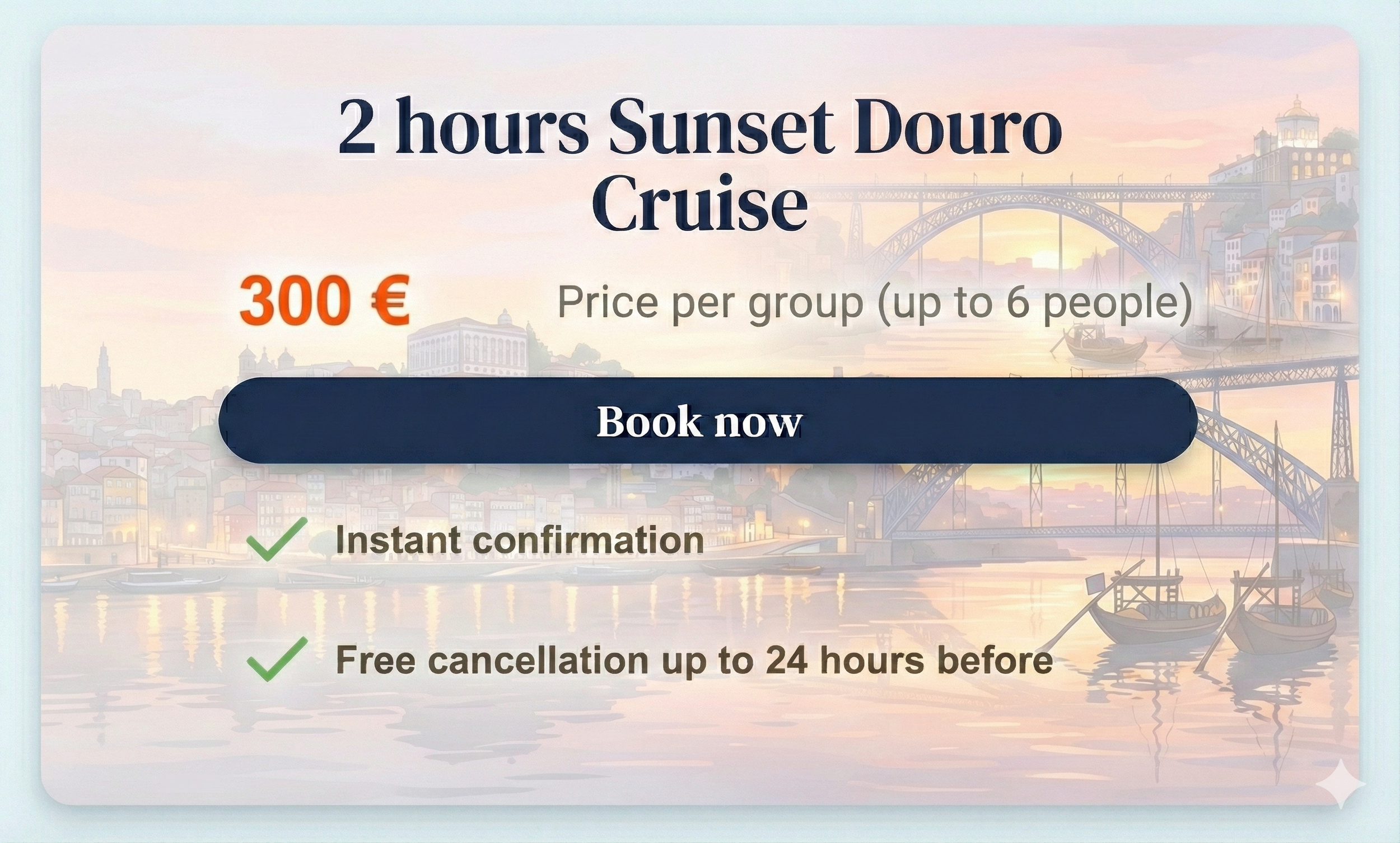 Enquanto o sol se põe, a luz dourada ilumina a Ribeira do Porto e Vila Nova de Gaia, criando um cenário inesquecível.Um momento único para relaxar e viver a magia do Porto a bordo.O passeio começa e termina na marina da afurada